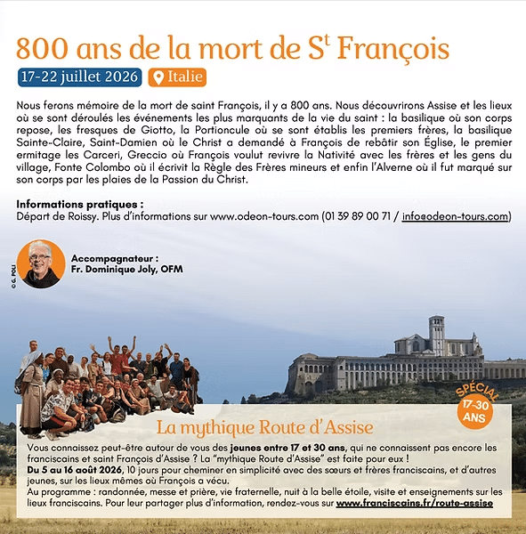 ► Vous trouvez toutes les infos (programme, tarifs, bulletins d’inscription…) sur le site « Pélérinages franciscains » : www.pelerinages-franciscains.com/assise-et-italie