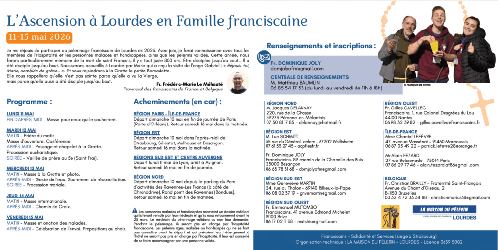 découvrant le site www.pelerinages-franciscains.com/lourdes. Pour tout renseignement, vous pouvez me rappeler ou me laisser un mail.