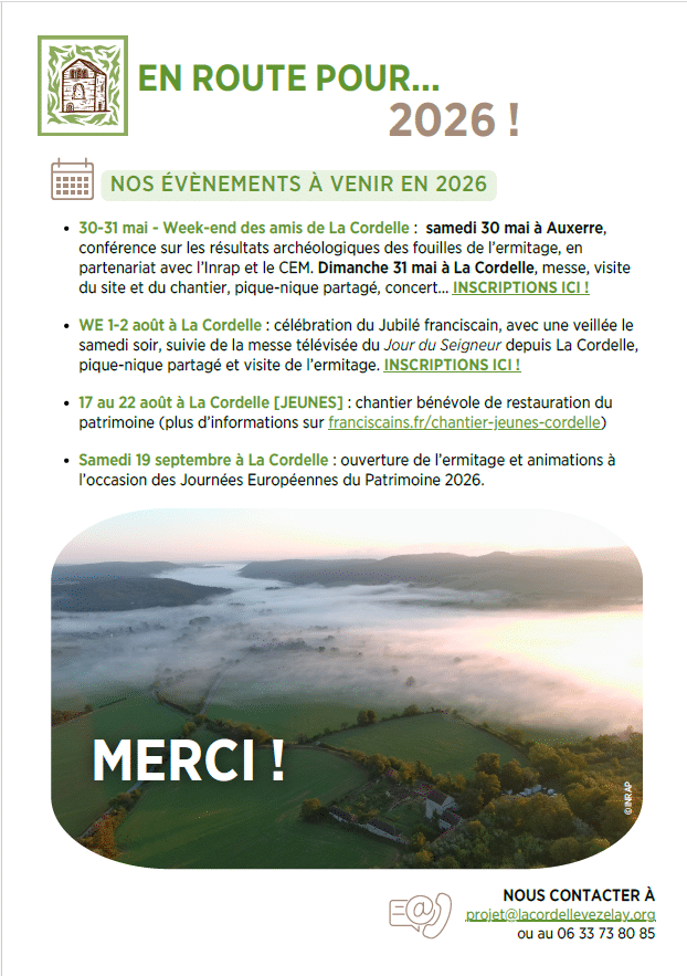- Dimanche 31 mai à La Cordelle (Vézelay), 10h-16h30 : messe à la chapelle, visite guidée de l’ermitage et du chantier, pique-nique partagé, animations et concert. Ouverture exceptionnelle des espaces habituellement fermés au public.