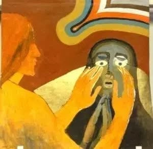 De cet homme tout entier ténèbres, Jésus veux faire le témoin de la venue de la Lumière divine en ce monde. Et pour cela Jésus va accomplir une curieuse thérapie : Il crache sur la terre et fait de la boue avec sa salive. Puis il couvre de cette boue les yeux de l’aveugle. Pourquoi cette boue sur ces yeux qui ne voient pas ? Et bien en se penchant vers la terre pour y faire de la boue, Jésus refait le geste du grand Commencement, le geste du Créateur dans la Genèse « Alors Dieu modela l’homme avec la Glaise du sol » (Gn 2,7) Jésus reprend en main la re-création de cet aveugle à partir du limon originel: il refait l’homme en l’ouvrant à la lumière divine. Mais en même temps, par ce geste Jésus associe aussi toute la Création à la naissance de l’homme à la lumière divine. C’est tout le vivant qui crie vers la lumière. Nos racines charnelles ont soif de lumière : elles veulent vivre en plénitude. Et ça va être tout le cheminement de l’aveugle né. Jésus envoie maintenant l’homme se laver à la piscine de Siloé ! Après la terre, c’est l’eau d’où jaillit la vie et donc la lumière.