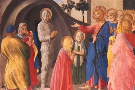 Nous ne pouvons rester insensibles devant l’appel de Jésus « Lazare, viens dehors ». C’est un ordre donné avec une autorité dont la force nous dépasse. Est-ce que cet appel ne s’adresse pas à chacun de nous, l’invitant à sortir de son tombeau intérieur pour transfigurer nos vies en une vie nouvelle traversée par la lumière de pâques ? Ce signe nous prépare à la mort et la résurrection de Jésus; il est lui‑même la Vie. Croire en lui, c’est être déjà saisi par une Vie plus forte que la mort. La vie éternelle nous est promise : c’est la communion avec Dieu et avec tous les saints.